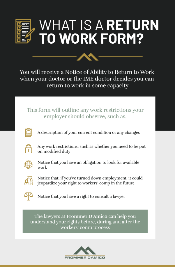 If you return to work, continue to protect yourself by practicing everyday preventive actions. He completes a thorough examination of your physical condition before filling out the physician's release to work form. Sending a back to work form to your manager after taking personal or medical leave is necessary. The work release form is a document that is used by medical personnel to inform an employer whether or not an employee is unable to return to work as result of illness or injury.if the employee is now able to return to work in a limited capacity. The return to work program must include:
